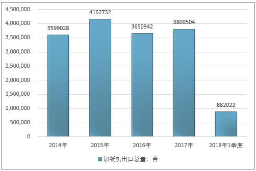 2016年我国切纸机出口总量3650942台 ,2017年出口总量3809504台 ;2019年1季度出口总量882022台 。