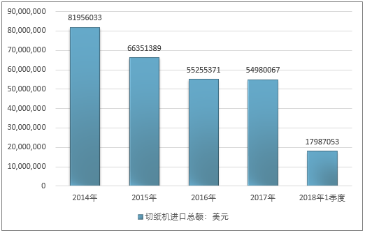 2016年我国切纸机进口总额55255371美元,2017年进口总额54980067美元;2019年1季度进口总额17987053美元。