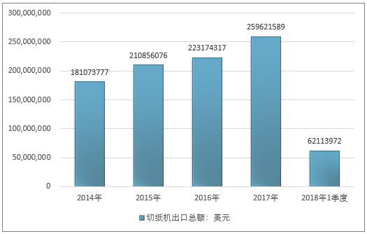 2016年我国切纸机出口总额223174317美元,2017年出口总额259621589美元;2019年1季度出口总额62113972美元。