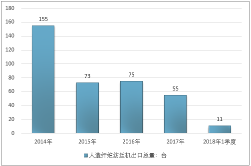 2016年我国人造纤维纺丝机出口总量75台 ,2017年出口总量55台 ;2019年1季度出口总量11台 。