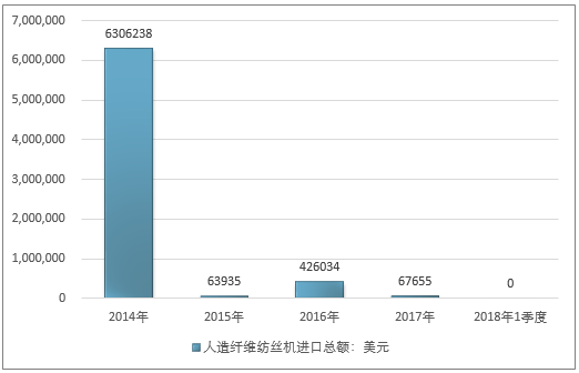2016年我国人造纤维纺丝机进口总额426034美元,2017年进口总额67655美元;2019年1季度进口总额-美元。