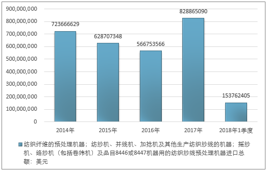 2016年我国纺织纤维的预处理机器;纺纱机、并线机、加捻机及其他生产纺织纱线的机器;摇纱机、络纱机(包括卷纬机)及品目8446或8447机器用的纺织纱线预处理机器进口总额566753566美元,2017年进口总额828865090美元;2019年1季度进口总额153762405美元。