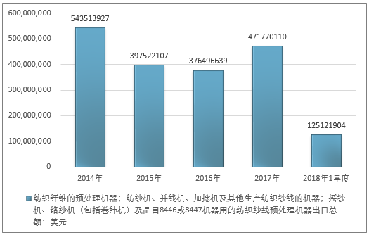 2016年我国纺织纤维的预处理机器;纺纱机、并线机、加捻机及其他生产纺织纱线的机器;摇纱机、络纱机(包括卷纬机)及品目8446或8447机器用的纺织纱线预处理机器出口总额376496639美元,2017年出口总额471770110美元;2019年1季度出口总额125121904美元。