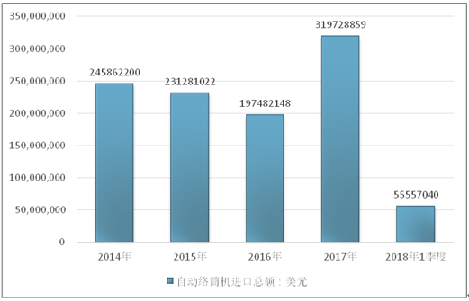 2016年我国自动络筒机进口总额197482148美元,2017年进口总额319728859美元;2019年1季度进口总额55557040美元。