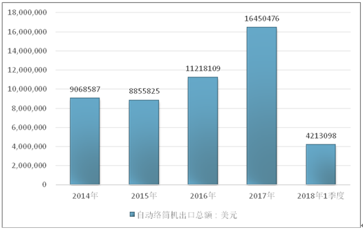 2016年我国自动络筒机出口总额11218109美元,2017年出口总额16450476美元;2019年1季度出口总额4213098美元。