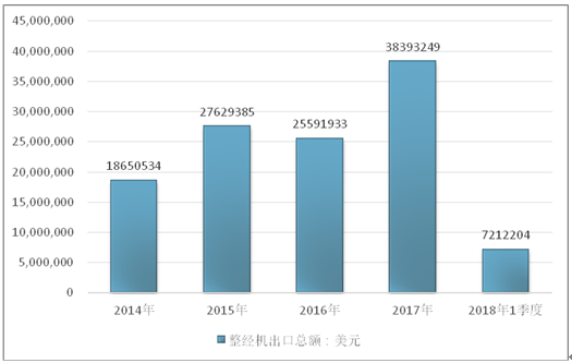 2016年我国整经机出口总额25591933美元,2017年出口总额38393249美元;2019年1季度出口总额7212204美元。