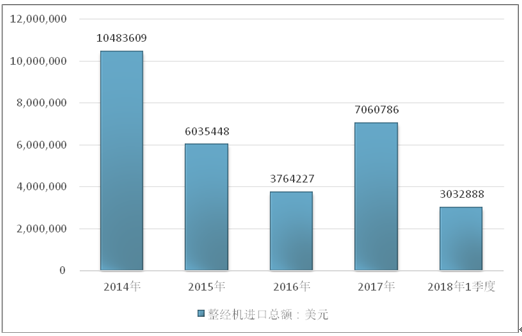 2016年我国整经机进口总额3764227美元,2017年进口总额7060786美元;2019年1季度进口总额3032888美元。