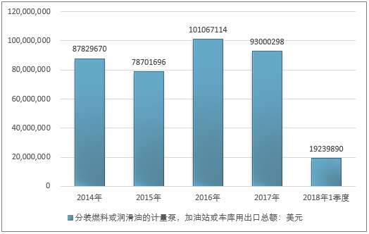 2016年我国分装燃料或润滑油的计量泵,加油站或车库用出口总额101067114美元,2017年出口总额93000298美元;2019年1季度出口总额19239890美元。