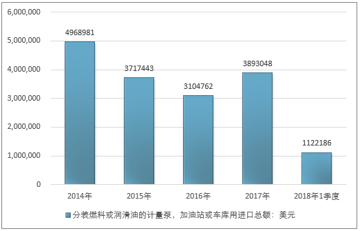 2016年我国分装燃料或润滑油的计量泵,加油站或车库用进口总额3104762美元,2017年进口总额3893048美元;2019年1季度进口总额1122186美元。