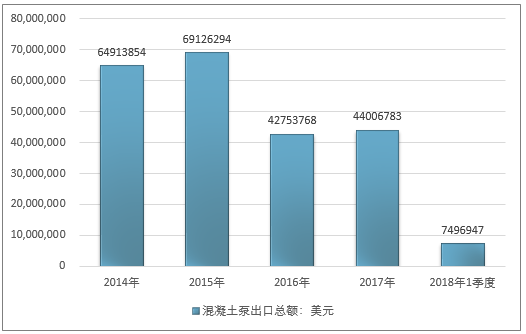 2016年我国混凝土泵出口总额42753768美元,2017年出口总额44006783美元;2019年1季度出口总额7496947美元。