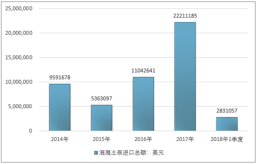 2016年我国混凝土泵进口总额11042641美元,2017年进口总额22211185美元;2019年1季度进口总额2831057美元。