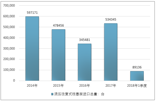 2016年我国液压往复式柱塞泵进口总量345481台 ,2017年进口总量534345台 ;2019年1季度进口总量89136台 。