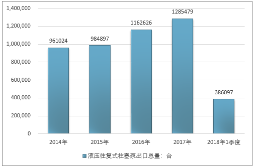 2016年我国液压往复式柱塞泵出口总量1162626台 ,2017年出口总量1285479台 ;2019年1季度出口总量386097台 。