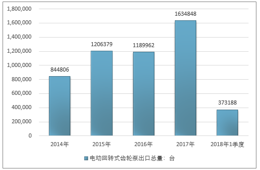 2016年我国电动回转式齿轮泵出口总量1189962台 ,2017年出口总量1634848台 ;2019年1季度出口总量373188台 。