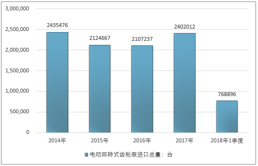 2016年我国电动回转式齿轮泵进口总量2107237台 ,2017年进口总量2402012台 ;2019年1季度进口总量768896台 。