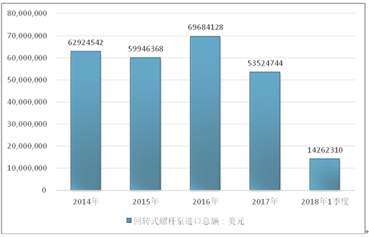 2016年我国回转式螺杆泵进口总额69684128美元,2017年进口总额53524744美元;2019年1季度进口总额14262310美元。