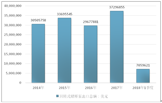2016年我国回转式螺杆泵出口总额29677881美元,2017年出口总额37296855美元;2019年1季度出口总额7059621美元。