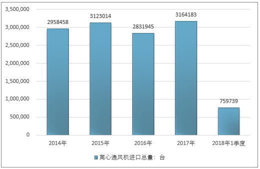 2016年我国离心通风机进口总量2831945台 ,2017年进口总量3164183台 ;2019年1季度进口总量759739台 。