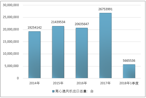 2016年我国离心通风机出口总量20635647台 ,2017年出口总量26753991台 ;2019年1季度出口总量5665536台 。