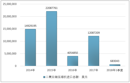 2016年我国二氧化碳压缩机进口总额4054850美元,2017年进口总额12087209美元;2019年1季度进口总额683043美元。