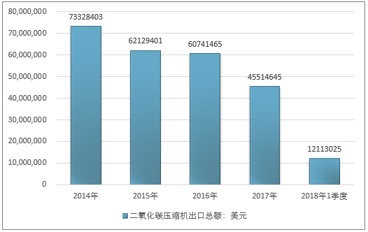 2016年我国二氧化碳压缩机出口总额60741465美元,2017年出口总额45514645美元;2019年1季度出口总额12113025美元。