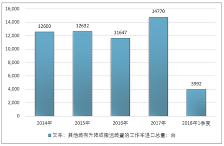 2016年我国叉车;其他装有升降或搬运装置的工作车进口总量11647台,2017年进口总量14770台;2019年1季度进口总量3992台。
