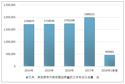2016年我国叉车;其他装有升降或搬运装置的工作车出口总量1742108台,2017年出口总量1989221台;2019年1季度出口总量459401台。