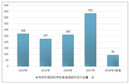 2016年我国电动机推进的有轨巷道堆跺机进口总量260台,2017年进口总量435台;2019年1季度进口总量94台。