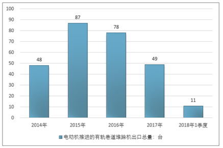 2016年我国电动机推进的有轨巷道堆跺机出口总量78台,2017年出口总量49台;2019年1季度出口总量11台。
