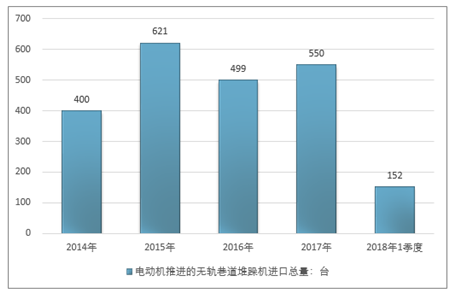 2016年我国电动机推进的无轨巷道堆跺机进口总量499台,2017年进口总量550台;2019年1季度进口总量152台。