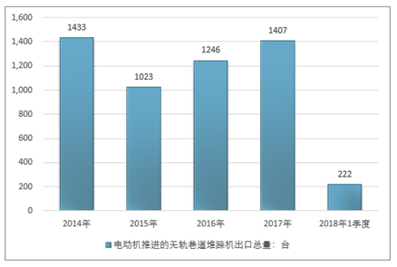 2016年我国电动机推进的无轨巷道堆跺机出口总量1246台,2017年出口总量1407台;2019年1季度出口总量222台。
