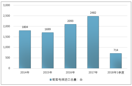 2016年我国载客电梯进口总量2093台,2017年进口总量2482台;2019年1季度进口总量714台。