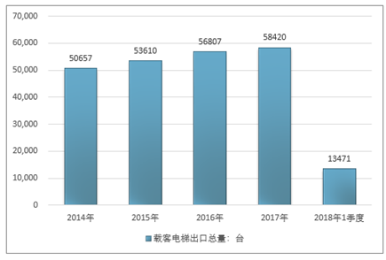 2016年我国载客电梯出口总量56807台,2017年出口总量58420台;2019年1季度出口总量13471台。