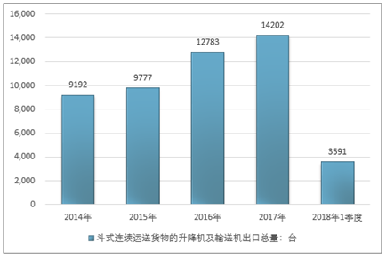 2016年我国斗式连续运送货物的升降机及输送机出口总量12783台,2017年出口总量14202台;2019年1季度出口总量3591台。