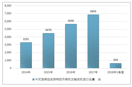 2016年我国斗式连续运送货物的升降机及输送机进口总量5646台,2017年进口总量6856台;2019年1季度进口总量644台。