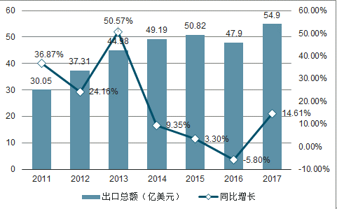 图表6:2017-2019年模具产量变化趋势(单位:万套,%)