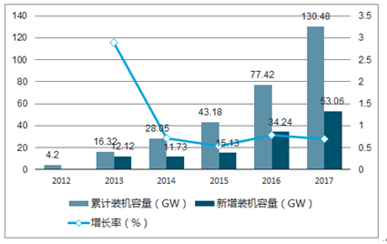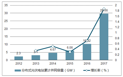2012-2017年我国分布式光伏电站累计并网容量(GW)