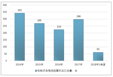 2016年我国轮胎式自推进起重机出口总量224台,2017年出口总量298台;2019年1季度出口总量62台。