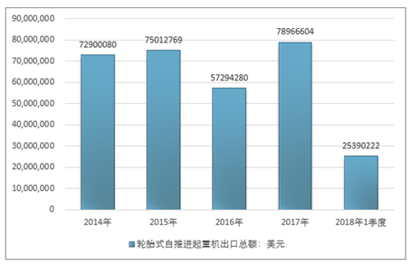 2016年我国轮胎式自推进起重机出口总额57294280美元,2017年出口总额78966604美元;2019年1季度出口总额25390222美元。