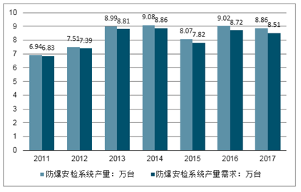2017年我国防爆安检系统产量为8.86万套, 2017年我国防爆安检系统需求量为8.51万套。