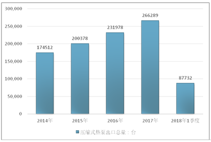 2016年我国压缩式热泵出口总量231978台,2017年出口总量266289台;2019年1季度出口总量87732台。