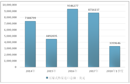 2016年我国压缩式热泵进口总额9346277美元,2017年进口总额8716137美元;2019年1季度进口总额3359646美元。