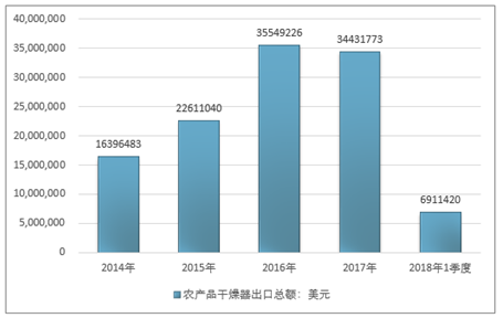 2016年我国农产品干燥器出口总额35549226美元,2017年出口总额34431773美元;2019年1季度出口总额6911420美元。