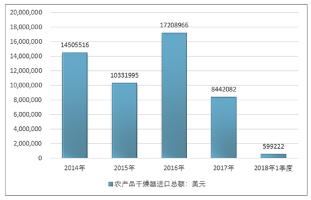 2016年我国农产品干燥器进口总额17208966美元,2017年进口总额8442082美元;2019年1季度进口总额599222美元。