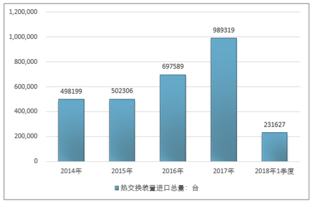2016年我国热交换装置进口总量697589台,2017年进口总量989319台;2019年1季度进口总量231627台。