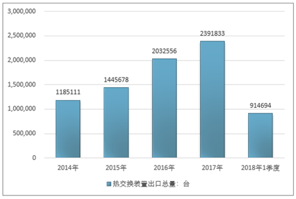 2016年我国热交换装置出口总量2032556台,2017年出口总量2391833台;2019年1季度出口总量914694台。