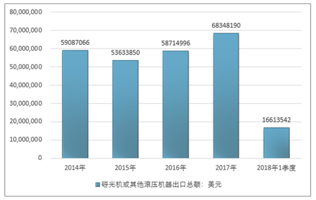 2016年我国砑光机或其他滚压机器出口总额58714996美元,2017年出口总额68348190美元;2019年1季度出口总额16613542美元。