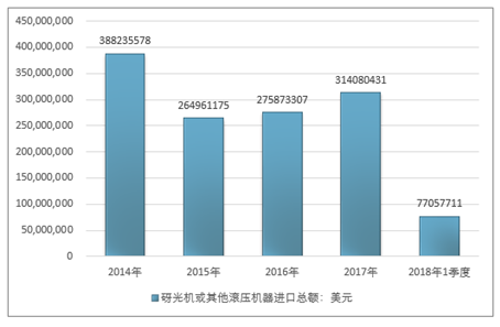 2016年我国砑光机或其他滚压机器进口总额275873307美元,2017年进口总额314080431美元;2019年1季度进口总额77057711美元。