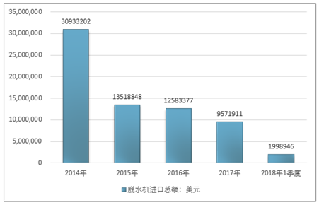 2016年我国脱水机进口总额12583377美元,2017年进口总额9571911美元;2019年1季度进口总额1998946美元。