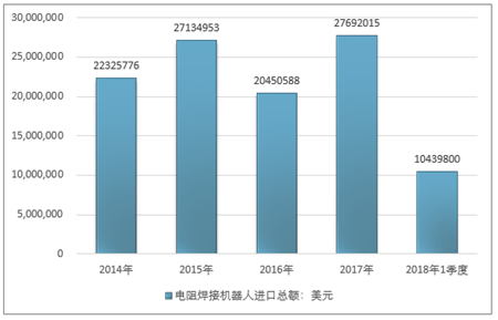 2016年我国电阻焊接机器人进口总额20450588美元,2017年进口总额27692015美元;2019年1季度进口总额10439800美元。